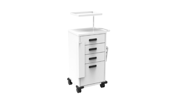 Carro de em pintura epóxi com 3 gavetas, sendo a 1ª gaveta com divisórias para medicamentos e a 2ª e a 3ª gaveta para uso geral. Possui na região inferior compartimento para uso geral com porta basculante, e na região superior mesa para preparação de medicamentos. Acompanha tábua para massagem cardíaca e bandeja de apoio.