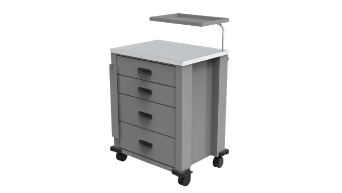 Carro de emergência em pintura epóxi com 4 gavetas, sendo a 1ª gaveta com divisórias para medicamentos e a 2ª, a 3ª e a 4ª gaveta para uso geral. Possui na região superior mesa com tampo em aço inoxidável para preparação de medicamentos. Acompanha tábua para massagem cardíaca e bandeja de apoio