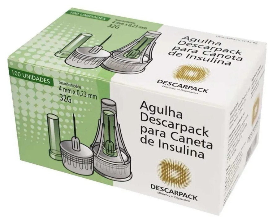 A agulha para caneta de insulina DESCARPACK é uma agulha para caneta de aplicação de insulina, confeccionada em aço inoxidável e atóxica. Possui bisel pentafacetado, e mede 4 mm de comprimento e 0,23 mm de diâmetro. É uma agulha mais curta e suave, facilitando a aplicação inclusive em locais de difícil acesso, como braços e nádegas. Indicada para todos os perfis corpóreos, podendo ser usada por adultos e crianças com diferentes perfis físicos, inclusive obesos. A agulha para caneta de insulina é um instrumento seguro e efetivo para pacientes com diabetes, e é uma alternativa menos invasiva do que as agulhas mais longas presentes no mercado. Compatível com a maioria de canetas disponíveis no mercado.