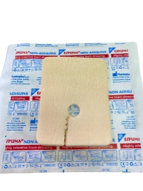 Curativo para traqueostomia em espuma e filme de poliuretano. Feita com uma camada suave, fina e elástica de espuma de poliuretano