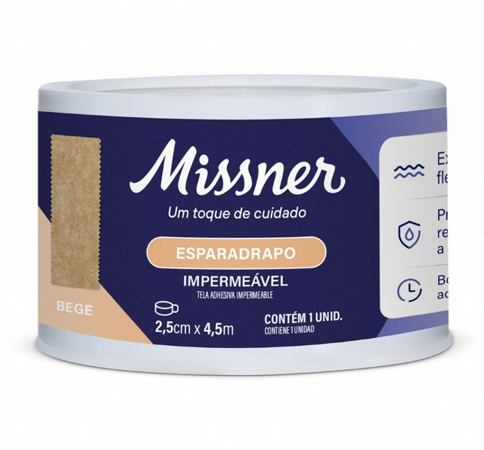 O Esparadrapo Impermeável Bege Missner 2,5cm x 4,5m é composto de tecido 100% algodão com uma camada impermeabilizante na parte superior, evitando que água e contaminantes externos penetrem no ferimento.