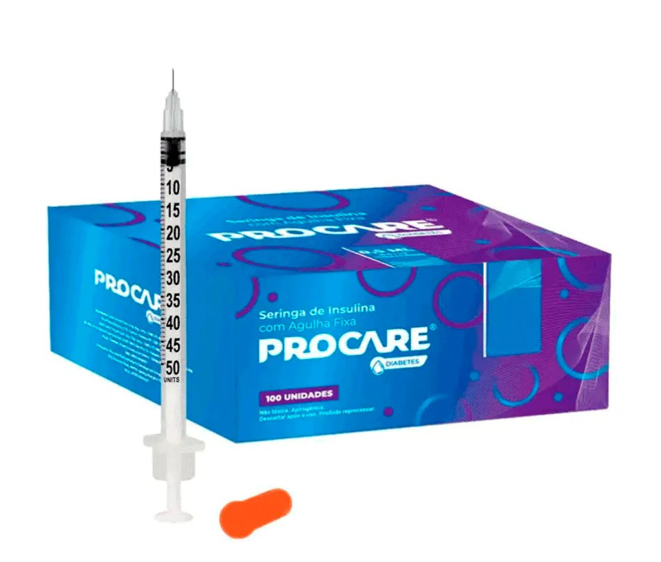 Caixa C/100 Seringas de Insulina 0,5ml (50ui) C/Agulha Fixa 8 x 0,30mm (30g) Procare