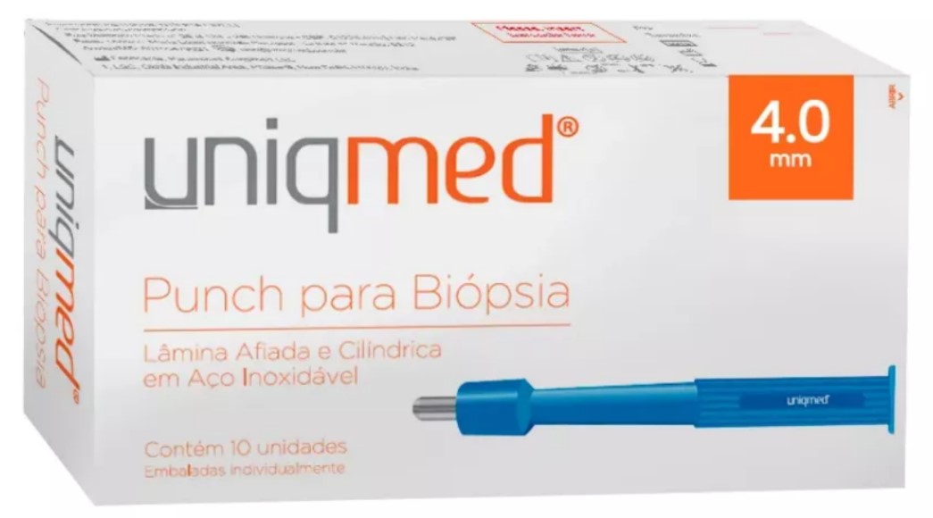 O Punch para Biopsia Uniqmed é constituído de uma lâmina em aço inoxidável, afiada e cilíndrica, acoplada a um cabo plástico